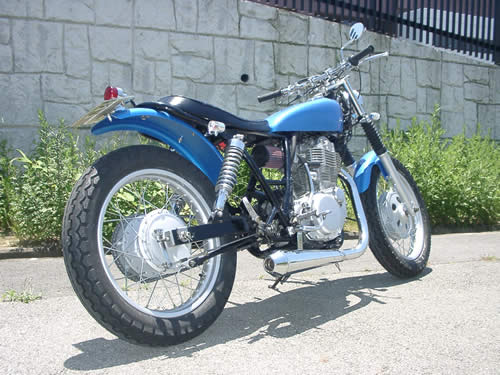 さわやかなアオメタにロンスイとループフレームで軽快さを出してみました。 シートのタックロールがいい感じです。グッズではシートの色,柄,パイピング,タックロールの形などがオーダーできます。 女性にもお勧めですね〜。かわいいバイクも作りますよー。